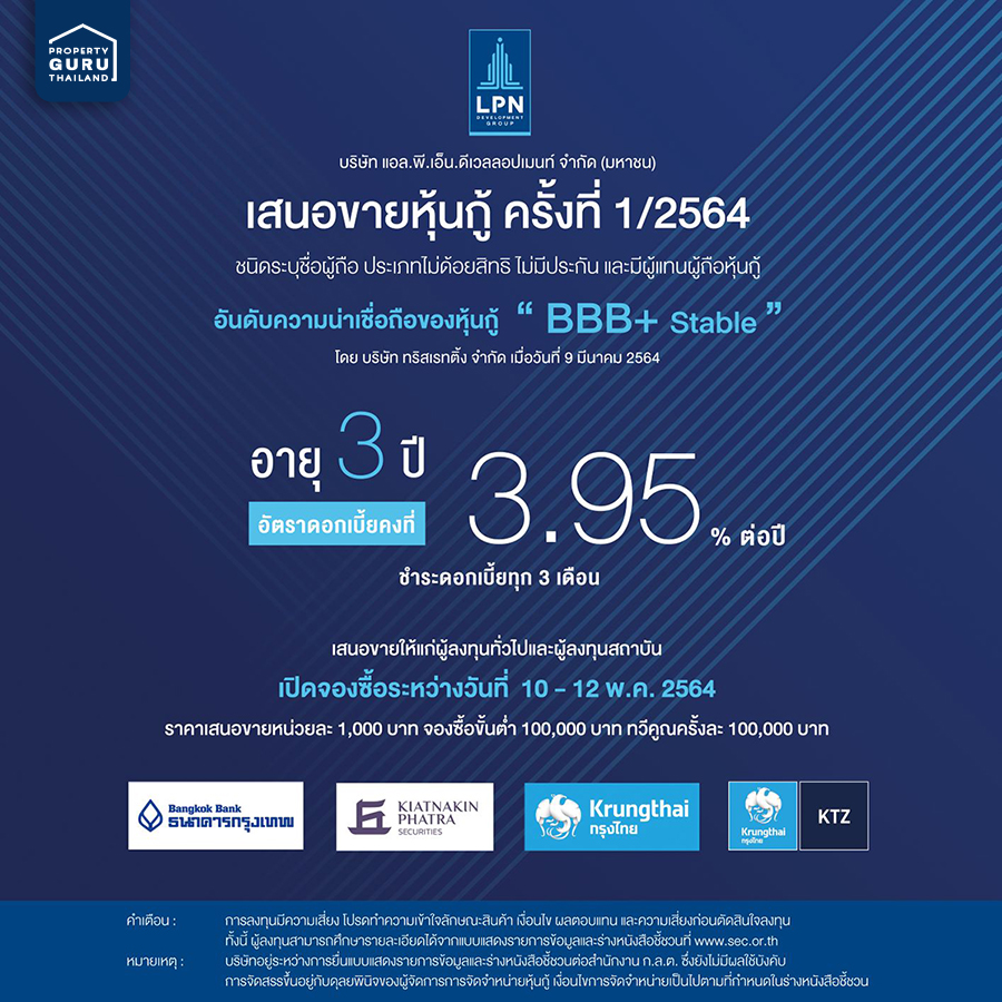 LPN เสนอขายหุ้นกู้ อายุ 3 ปี แก่นักลงทุนทั่วไป ดอกเบี้ยคงที่ 3.95% วันที่ 10 - 12 พ.ค. 64