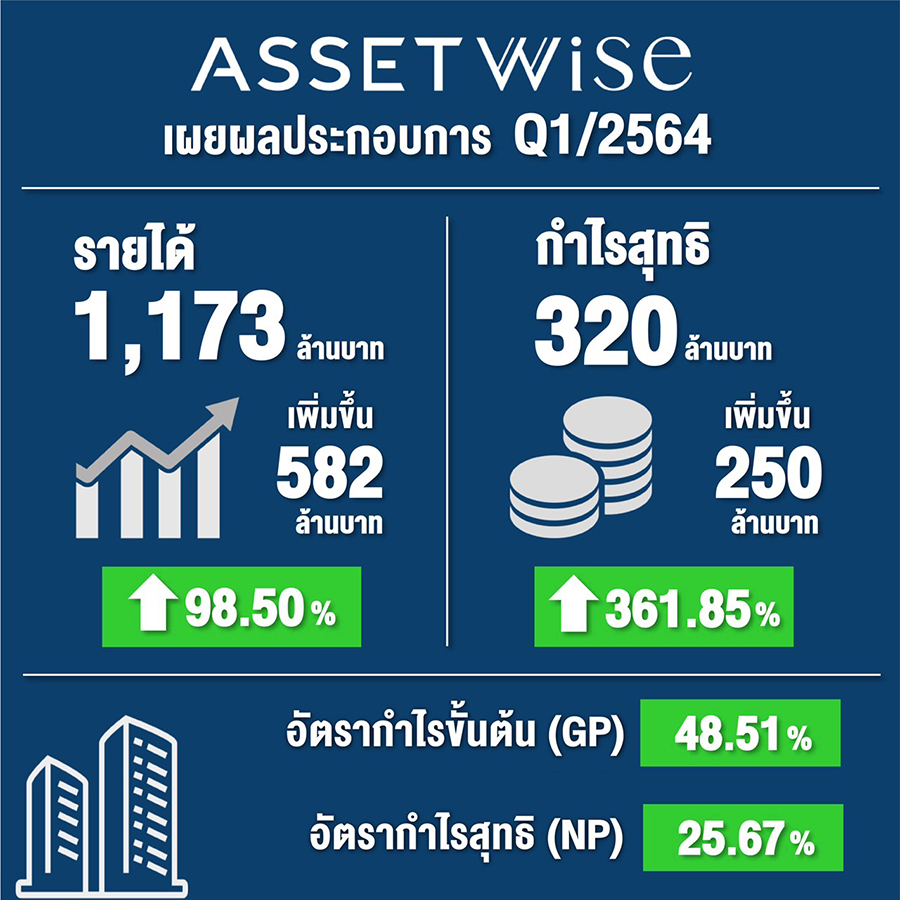 นายกรมเชษฐ์ วิพันธ์พงษ์ ประธานเจ้าหน้าที่บริหาร บริษัท แอสเซทไวส์ จำกัด (มหาชน) (ASW) เปิดเผยว่า ผลการดำเนินงานของบริษัทในไตรมาส 1/2564 (สิ้นสุดวันที่ 31 มีนาคม 2564) มีรายได้ 1,173 ล้านบาท เพิ่มขึ้น 582 ล้านบาท คิดเป็นอัตราเติบโตสูงถึง 98.5% เมื่อเทียบกับไตรมาสเดียวกันของปีก่อนที่มีรายได้ 591 ล้านบาท และมีกำไรสุทธิ 320 ล้านบาท เพิ่มขึ้น 250 ล้านบาท หรือ 361.8% เทียบช่วงเดียวกันของปีก่อนที่มีกำไรสุทธิ 69 ล้านบาท ขณะที่มีอัตรากำไรขั้นต้น (Gross Profit Margin) ถึง 48.5 % และอัตรากำไรสุทธิ (Net Profit Margin) ถึง 25.7% นับเป็นการเติบโตแบบสวนกระแสในยุคโควิด นอกจากนี้ ด้วยการบริหารจัดการต้นทุนได้อย่างมีประสิทธิภาพ ทำให้อัตราหนี้สินต่อทุน (D/E) ปรับตัวลดลงหลังเข้าระดมทุนในตลาดหลักทรัพย์ฯ