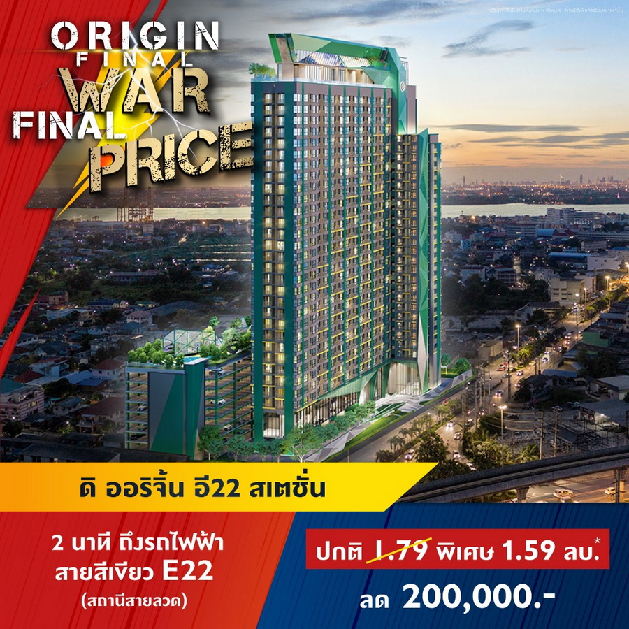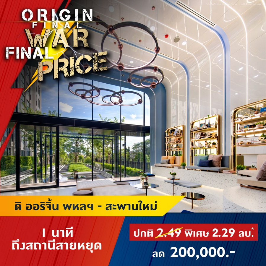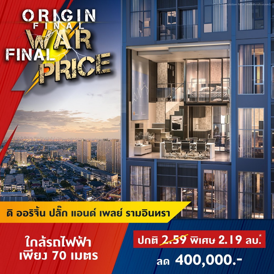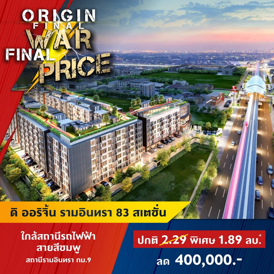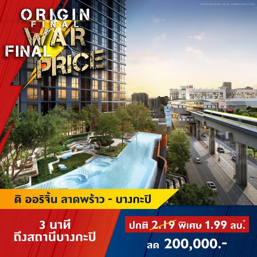 บริษัท ออริจิ้น พร็อพเพอร์ตี้ จำกัด (มหาชน) หรือ ORI ยกทัพคอนโดพร้อมอยู่ 11 โครงการใกล้รถไฟฟ้าในทำเลสุดฮอต ทั่วกรุงเทพ และ EEC ร่วมแคมเปญ "ORIGIN FINAL WAR FINAL PRICE" สงครามราคาครั้งสุดท้ายให้มันจบที่เรา พบกับราคาพิเศษครั้งเดียวเท่านั้น ส่วนลดสูงสุด 1,000,000 บาท* ลุ้นรางวัลมูลค่า 1.8 ล้าน* TOTOTA CROSS ฟรีค่าใช้จ่ายวันโอน และฟรีของแถมอีกหลายรายการ ราคาเริ่มต้น 1.59 ล้านบาทโครงการเข้าที่เข้าร่วมแคมเปญ- ดิ ออริจิ้น ลาดพร้าว-บางกะปิ (The Origin Ladprao-Bangkapi) ราคาพิเศษ 1.99 ลบ*