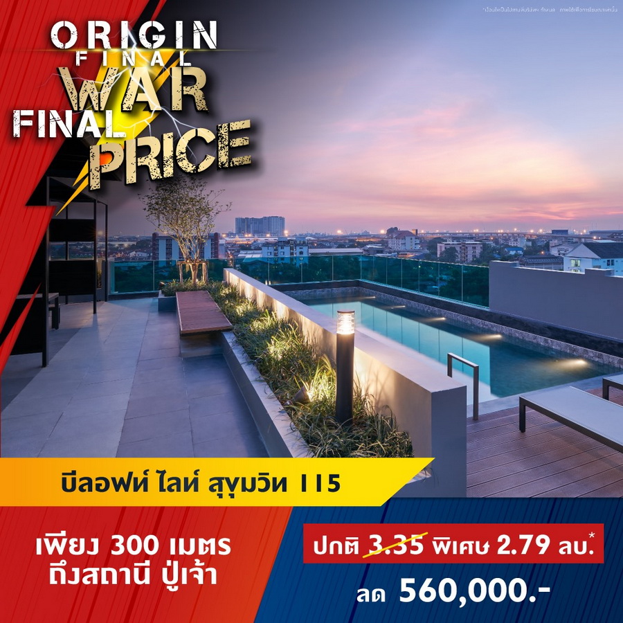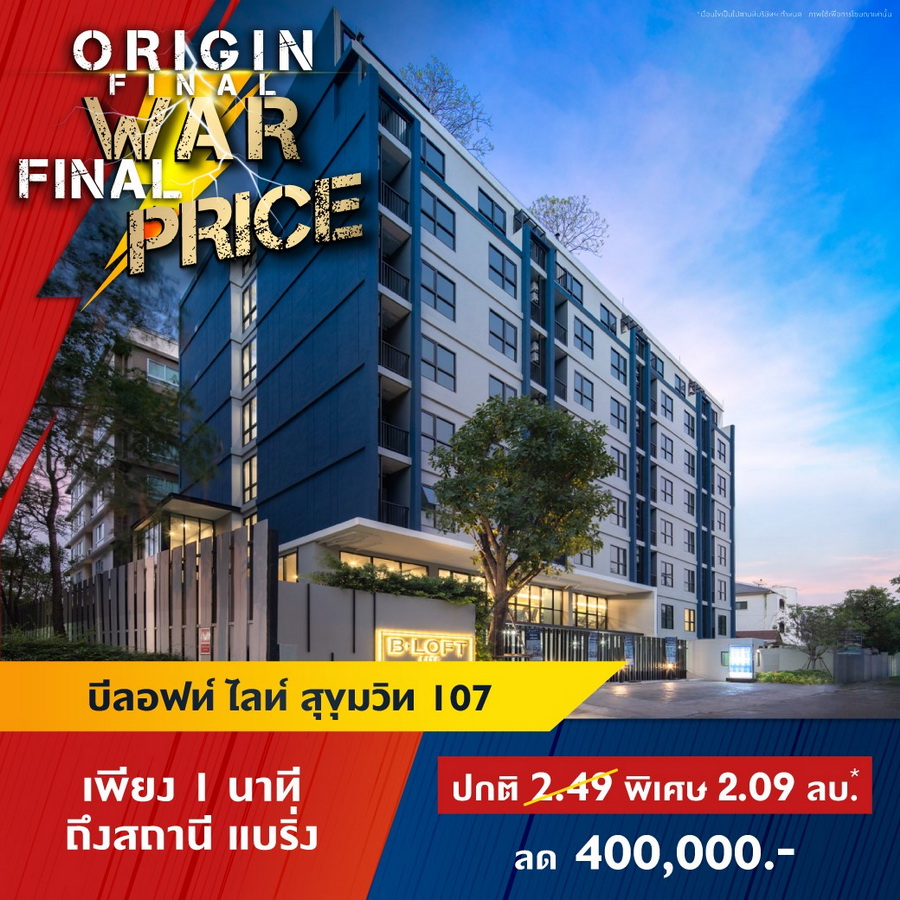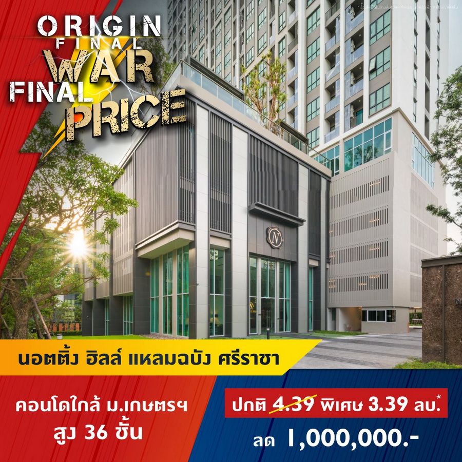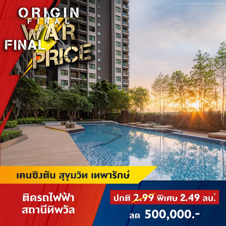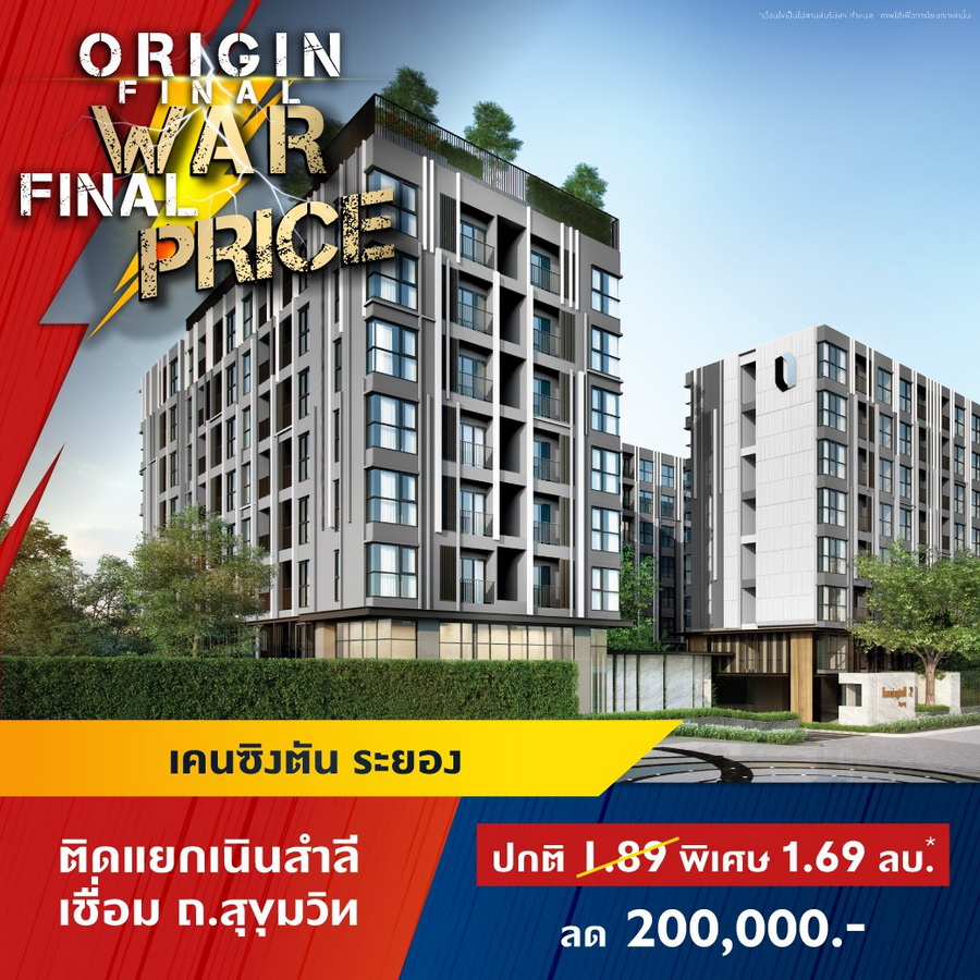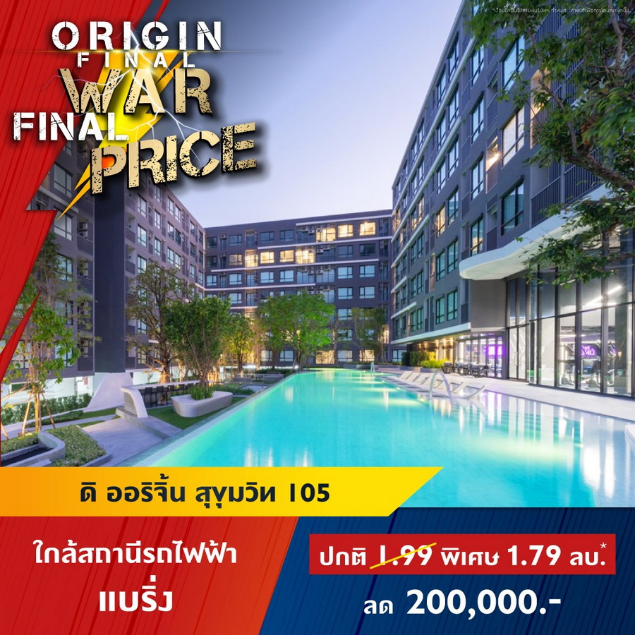 บริษัท ออริจิ้น พร็อพเพอร์ตี้ จำกัด (มหาชน) หรือ ORI ยกทัพคอนโดพร้อมอยู่ 11 โครงการใกล้รถไฟฟ้าในทำเลสุดฮอต ทั่วกรุงเทพ และ EEC ร่วมแคมเปญ "ORIGIN FINAL WAR FINAL PRICE" สงครามราคาครั้งสุดท้ายให้มันจบที่เรา พบกับราคาพิเศษครั้งเดียวเท่านั้น ส่วนลดสูงสุด 1,000,000 บาท* ลุ้นรางวัลมูลค่า 1.8 ล้าน* TOTOTA CROSS ฟรีค่าใช้จ่ายวันโอน และฟรีของแถมอีกหลายรายการ ราคาเริ่มต้น 1.59 ล้านบาทโครงการเข้าที่เข้าร่วมแคมเปญ- ดิ ออริจิ้น ลาดพร้าว-บางกะปิ (The Origin Ladprao-Bangkapi) ราคาพิเศษ 1.99 ลบ*