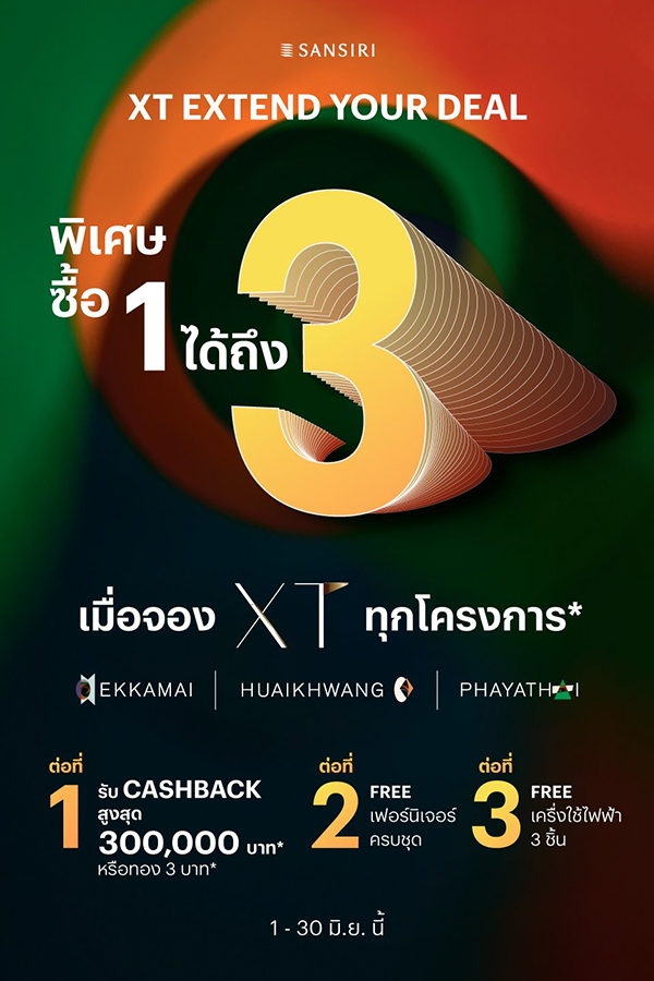 แสนสิริ จัดโปร "XT Extend your Deal" ซื้อ 1 ได้ถึง 3 จองคอนโด XT วันนี้ - 30 มิถุนายนี้! รับทันทีดีลพิเศษ 3 ต่อ ต่อที่ 1 รับ Cashback สูงสุด 300,000 บาท* หรือทอง 3 บาท* ต่อที่ 2 ฟรี! เฟอร์นิเจอร์ครบชุด* ต่อที่ 3 ฟรี! เครื่องใช้ไฟฟ้า 3 ชิ้น* พิเศษยิ่งกว่าสำหรับชาว XT Club! สัมผัสประสบการณ์ใหม่ กับไลฟ์สไตล์ที่แตกต่าง เข้าใช้ Facilities ที่ชั้น 1 ของ XT ได้ทุกโครงการ ทั้ง Co-work & Play Space, Creative Studio และ Creative Playground ได้อย่างปลอดภัยและอุ่นใจ ภายใต้นโยบายดูแลความสะอาดอย่างเข้มงวด ‘Sansiri Care…เพราะเราห่วงใย’ เพียงจองผ่าน Sansiri Home Service Application