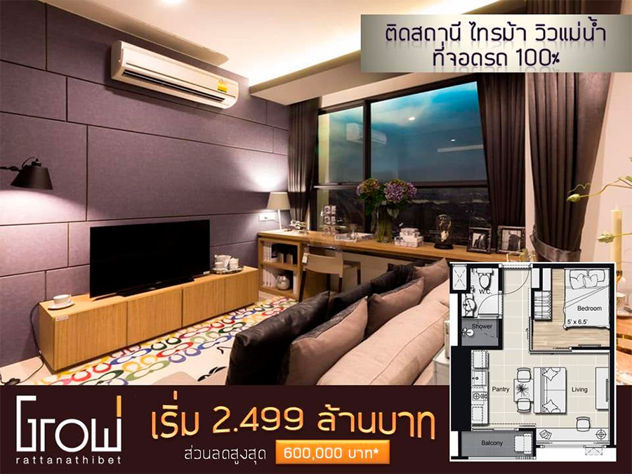 โกรว รัตนาธิเบศร์ (Grow Rattanathibet) คอนโดติดรถไฟฟ้า MRT สายสีม่วง สถานีไทรม้า 0 เมตร คอนโดพร้อมอยู่สไตล์ Minimal Contemporary วิวแม่น้ำเจ้าพระยา จำนวนยูนิตน้อยเพียง 364 ห้องเท่านั้น ได้ความเป็นส่วนตัว ส่วนกลางจัดเต็ม Facility 3 ชั้น ที่จอดรถ 100% ใกล้ห้างสรรพสินค้าเซ็นทรัล รัตนาธิเบศร์
