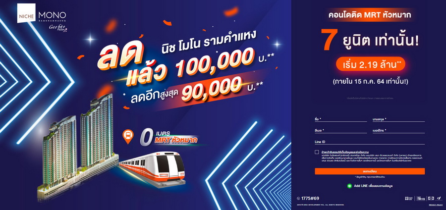 โปรโมชั่น : ลดแล้ว 100,000 ลดอีกสูงสุด 90,000 บาท* 7 ยูนิตเท่านั้น (ภายสน 15 ก.ค. 64 เท่านั้น)