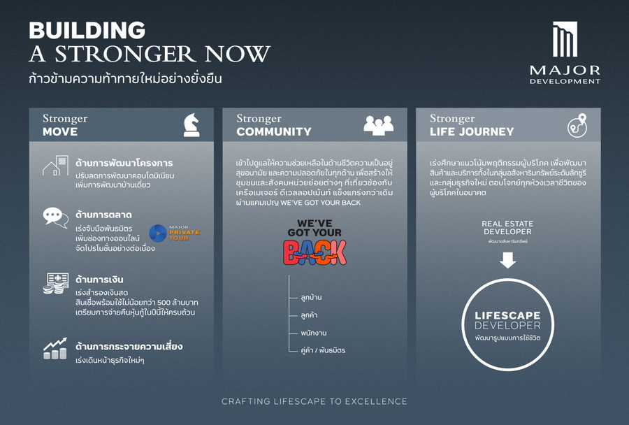 "เมเจอร์ ดีเวลลอปเม้นท์" เปิดแผนกลยุทธ์ "Building A Stronger Now" ชู 3 แกนปรับองคาพยพแกร่งกว่าเดิม รับมือโควิด-19 และทุกความท้าทายครึ่งปีหลังอย่างยั่งยืน ลุย Stronger Move เพื่อองค์กร ปรับแผนการพัฒนาโครงการ เปิดช่องทางการตลาดใหม่ รักษาเสถียรภาพกระแสเงินสด กระจายความเสี่ยงสู่ธุรกิจใหม่ Stronger Community เพื่อลูกบ้าน-พนักงาน-พันธมิตร ผ่านแคมเปญ We've got your back และ Financial Solution และ Stronger Life Journey เพื่อลูกค้าใหม่ ศึกษา Customer Journey ที่เปลี่ยนแปลงไป ปรับทิศทางสินค้าและบริการระดับลักซูรีแห่งอนาคต