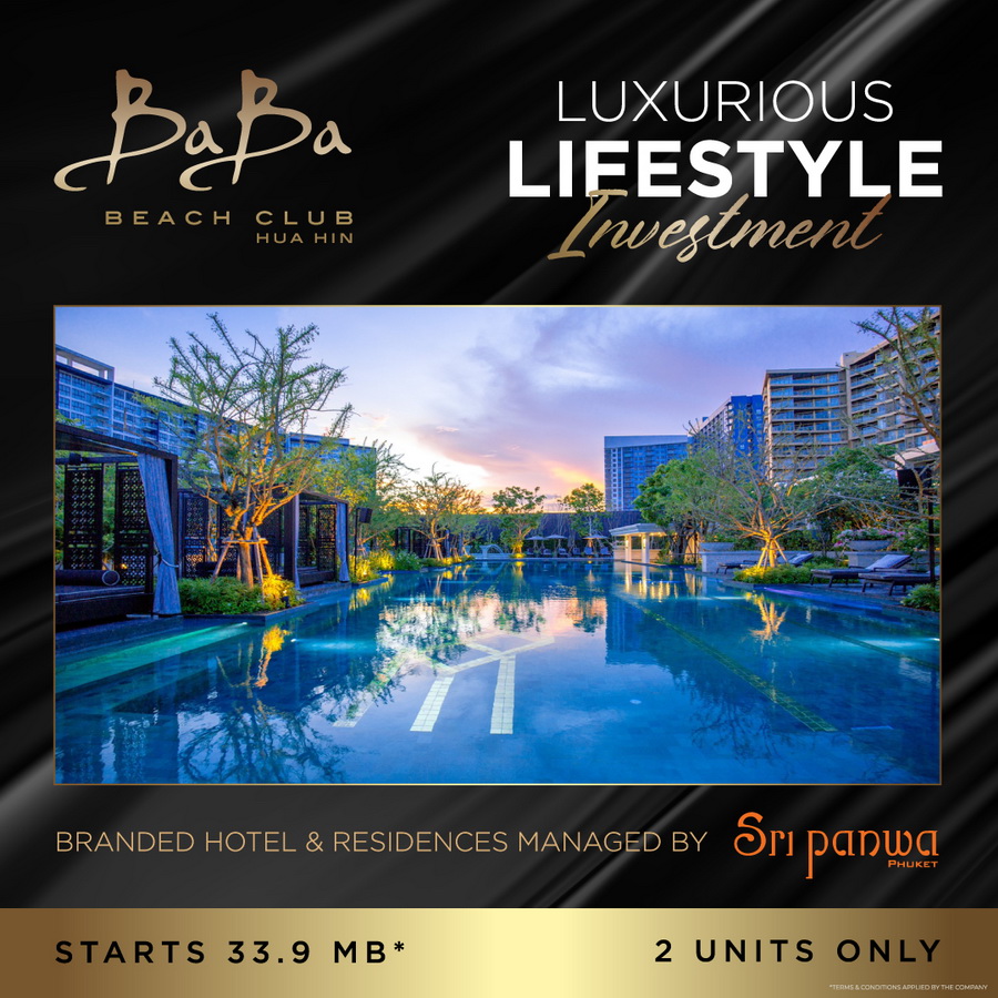 บาบา บีช คลับ เรสซิเดนซ์ หัวหิน พูลวิลล่าสุดหรู จัดโปรโมชั่น Luxurious Lifestyle Investment มอบสิทธิพิเศษ และการบริหารจัดการด้านการลงทุนปล่อยเช่า โดยทีมบริหารโรงแรมศรีพันวา พร้อมสิทธิการถือครองทรัพย์สินแบบ Freehold เพียง 2 ยูนิตเท่านั้น ราคาเริ่มต้น 33.9 ลบ.