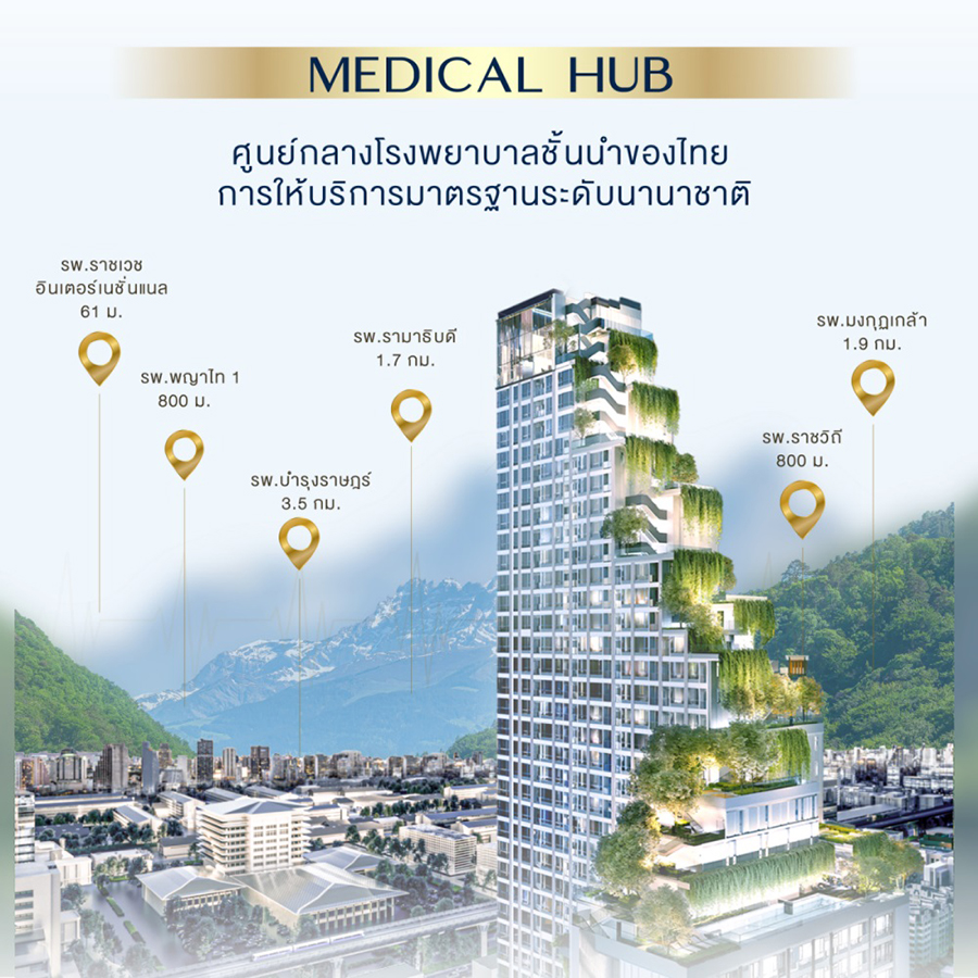 Health & Wellness นับเป็นหนึ่งในเมกะเทรนด์ที่จะเข้ามาแทรกอยู่ในทุกมิติของการใช้ชีวิตหลังจากนี้ ความสะดวกในการเข้าถึงบริการด้านสุขภาพจึงกลายเป็นอีกปัจจัยที่หลายคนกำลังมองหาเมื่อต้องเลือกที่อยู่อาศัยในยุค New Normal ไม่ว่าจะฟังก์ชันรองรับด้านสุขภาพภายในโครงการ หรือตั้งอยู่ใกล้สถานพยาบาล ทำเล “พญาไท” จึงกลายเป็นหนึ่งในโลเคชั่นที่น่าจับตามองอย่างมาก นอกจากอยู่ในย่านศูนย์กลางธุรกิจ (CBD) แล้ว ยังขึ้นชื่อว่าเป็น Medical Hub แหล่งรวมโรงพยาบาลชั้นนำ ทำให้โครงการ