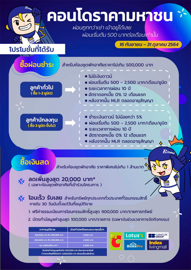 BAM จัดงาน "คอนโดราคามหาชน" มาพร้อมกับโปรโมชั่นจัดเต็ม ผ่อนถูกกว่าเช่า เข้าอยู่ได้เลยเริ่มต้นเพียง 500 บาทต่อเดือน คัดคอนโดทำเลดีกว่า 1,500 รายการ อัดโปรแรงลดราคาสูงสุดกว่า 60% ซื้อเงินสดลดเพิ่มอีก 2 หมื่นบาท ซื้อทรัพย์ผ่อนชำระกับ BAM คิดดอกเบี้ย 0% 12 เดือน ลูกค้าโอนเร็ว รับเลย ฟรีค่าโอนสูงสุด 9 แสนบาท และบัตรกำนัลมูลค่าสูงสุด 1 แสนบาท