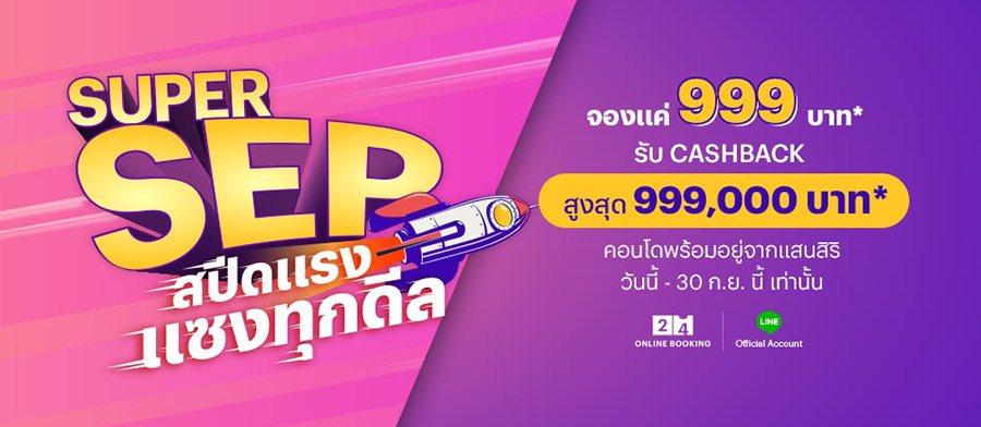 อีกหนึ่งโปรเด็ดจากแสนสิริ คือโปร Super Sep สปีดแรง แซงทุกดีล จองแค่ 999 บาท* รับ Casgback สูงสุด 900,000 บาท* กับ 8 คอนโดพร้อมอยู่ วันนี้ - 30 กันยายนนี้