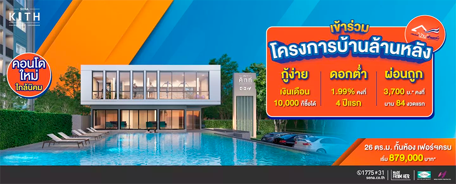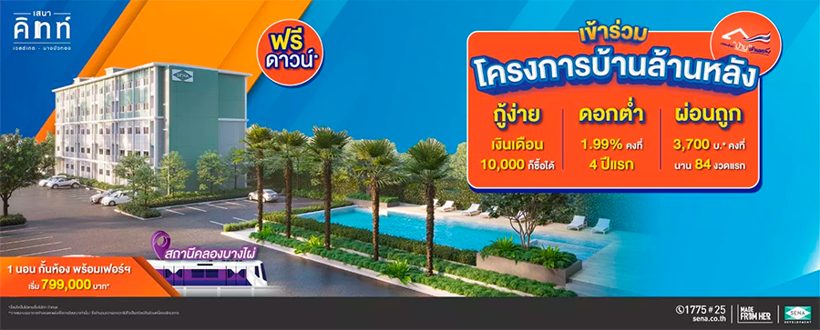 SENA จัดแคมเปญ "บ้านล้านหลัง (เฟส 2)" แบรนด์ "เสนาคิทท์" ผ่อนนานสูงสุด 40 ปี ผ่อนเริ่มต้น 3,700 บ./ด.