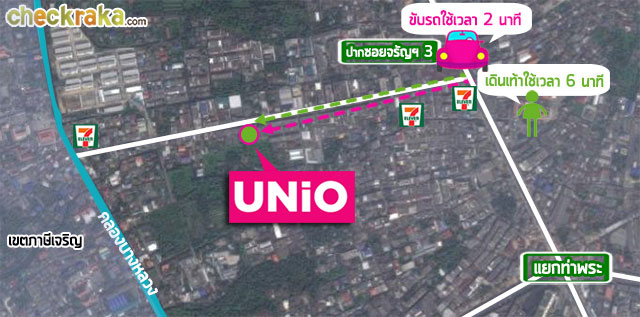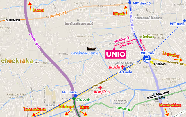 แผนที่โครงการยูนิโอ คอนโด จรัญฯ 3 ห่างจากรถไฟฟ้าสถานีท่าพระ ประมาณ 900 เมตร