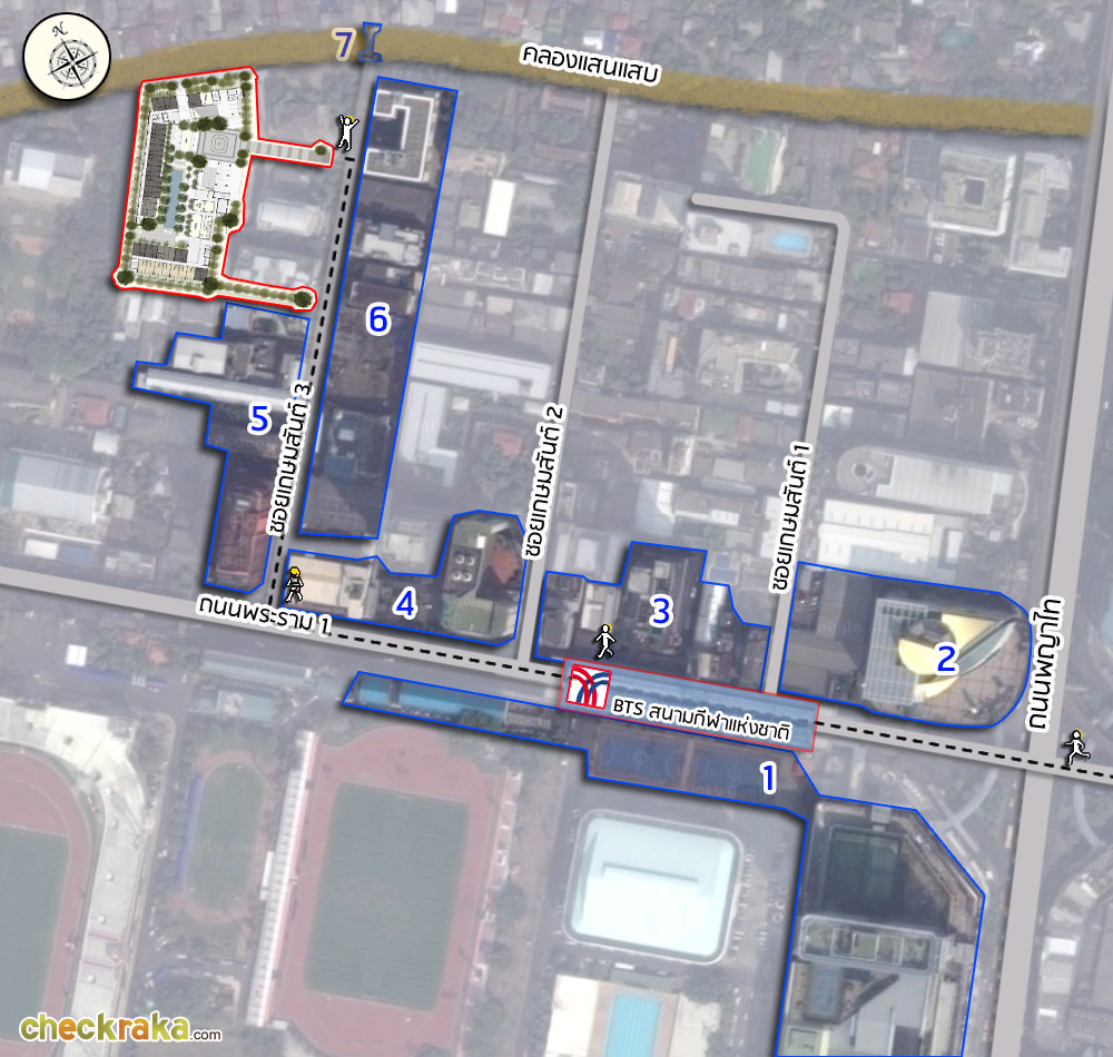 สำหรับทำเลของโครงการที่ถือว่าเป็นทำเลใจกลางเมืองที่สำคัญทีเดียวค่ะ อยู่ใกล้ห้างสรรพสินค้าชื่อดังหลายๆ แห่ง ทั้งสยามเซ็นเตอร์, สยามดิสคัฟเวอรี่, และที่ใกล้สุดๆ ก็คือมาบุญครองค่ะ ห่างจากโครงการ 600 เมตรเท่านั้น และยังมีสถานที่สำคัญอย่างหอศิลปวัฒนธรรมแห่งกรุงเทพฯ สนามกีฬาแห่งชาติ เรื่องการเดินทางถือว่าสะดวกสุดๆ ด้วยรถไฟฟ้า BTS สถานีสนามกีฬาแห่งชาติ ที่มีระยะห่างจากโครงการเพียง 450 เมตรเท่านั้น เอาล่ะค่ะ เราไปสำรวจพื้นที่กันเลยดีกว่า