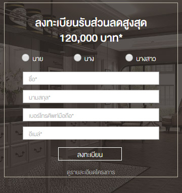 ลงทะเบียนที่เว็บไซต์เพื่อรับส่วนลดสูงสุดถึง 120,000 บาท พิเศษจองห้องวันนี้ได้ห้องแบบ Fully Furnished