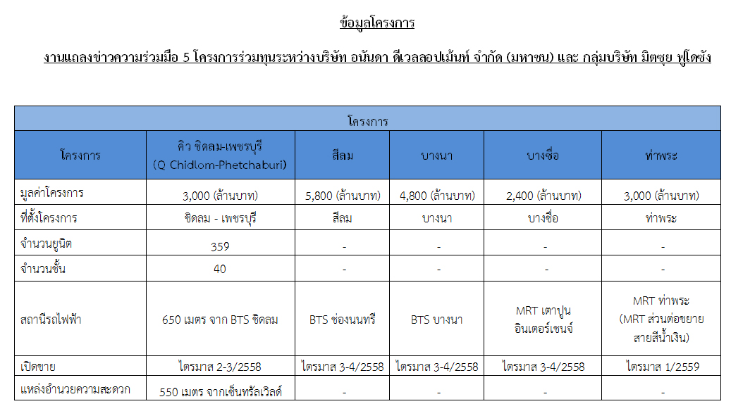 จากความสำเร็จในการบรรลุข้อตกลงการร่วมทุนพัฒนาอสังหาริมทรัพย์แนวรถไฟฟ้าในประเทศไทยกับบริษัท มิตซุย ฟูโดซัง เรสซิเด็นเชียล จำกัด (MFR) ทำให้ในปี 2555 อนันดาประสบความสำเร็จในการพัฒนาโครงการคอนโดมิเนียม 4 โครงการ ภายในระยะเวลาเพียง 2 ปี ด้วยจำนวนยูนิตกว่า 4,100 ยูนิต มูลค่าโครงการกว่า 26,000 ล้านบาท ซึ่งได้รับการตอบรับดีเยี่ยมจากกลุ่มลูกค้า Gen C และนักลงทุนเกินความคาดหมายที่ตั้งไว้เป็นอย่างมาก และในปี 2558 บริษัทฯ ยังได้รับความเชื่อมั่นและไว้วางใจในการร่วมทุนครั้งใหญ่อย่างต่อเนื่องอีกครั้ง โดยมีการพัฒนาคอนโดมิเนียมแนวรถไฟฟ้าร่วมกันอีก 5 โครงการ จำนวนยูนิตรวมกว่า 4,200 ยูนิต มูลค่าโครงการรวมกว่า 19,000 ล้านบาท ซึ่งได้มีการลงนามข้อตกลงกันไปเมื่อวันที่ 19 พฤษภาคม 2558 ณ กรุงโตเกียว ประเทศญี่ปุ่น นับเป็นการตอกย้ำความเป็นผู้นำการพัฒนาโครงการคอนโดมิเนียมติดรถไฟฟ้าได้เป็นอย่างดี โดยอนันดาฯ จะถือครองหุ้นในสัดส่วน 49% กลุ่มมิตซุย 49% และนักลงทุนรายย่อยถือหุ้นสัดส่วน 2% ที่เหลือ ซึ่งอนันดาฯ จะรับหน้าที่หลักในการบริหารงานโครงการทั้งหมด