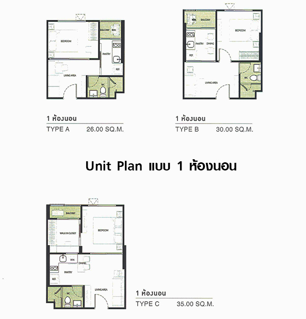 | 1 ห้องนอน Type A | 26.00 | ประมาณ 2.70 - 3.10 |