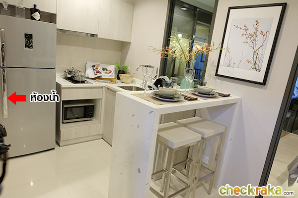 ด้านนี้จะเป็นโซนครัวค่ะ ครัวจะเป็นครัวเปิดตั้งอยู่บริเวณกลางของห้อง ซ้ายมือจะเป็นห้องน้ำ