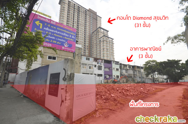 มองจากด้านหน้าทางเข้าไปทางซ้าย โครงการอยู่ติดกับอาคารพาณิชย์ สูง 3 ชั้น และคอนโด Diamond สุขุมวิท สูง 31 ชั้น