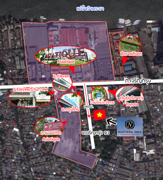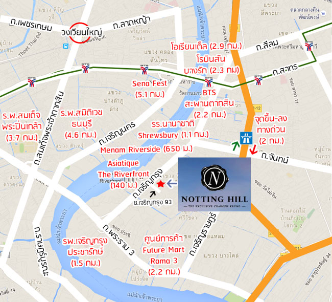 แผนที่สถานที่ต่างๆ บริเวณใกล้เคียง โครงการ นอตติ้ง ฮิลล์ ดิ เอ็กซ์คลูซีฟ เจริญกรุงหากเดินข้ามถนนมาจากเอเชียทีค เข้าซอยเจริญกรุง 93 มาประมาณ 140 ม. ก็ถึงโครงการแล้วค่ะ