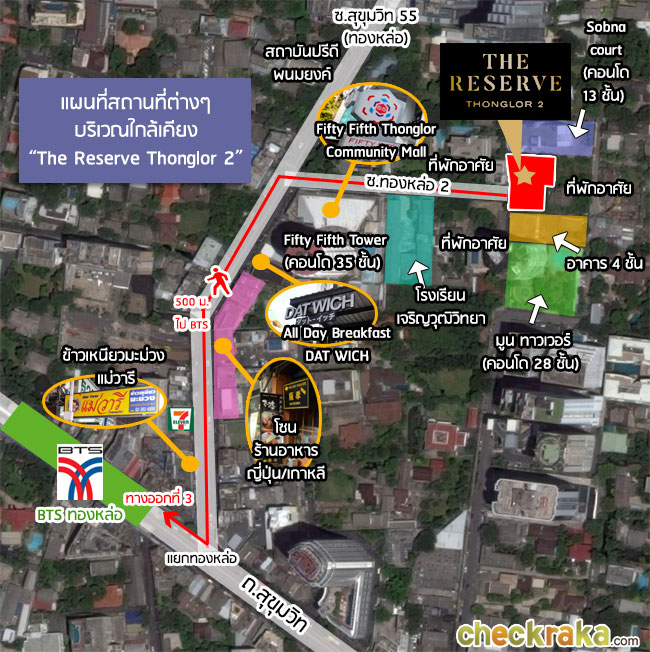 พรีวิวทำเลคอนโดใหม่รอบนี้ เรามากันที่ถนนทองหล่ออีกครั้ง เพื่อลงพื้นที่ดูโครงการ "เดอะ รีเซิร์ฟ ทองหล่อ 2 (The Reserve Thonglor 2)" จาก บริษัท พฤกษา เรียลเอสเตท จำกัด (มหาชน) กับคอนโดหรูส่วนตัวภายในซอยทองหล่อ 2 ห่างจากรถไฟฟ้า BTS สถานีทองหล่อ 500 ม. ออกแบบ และเลือกใช้วัสดุคุณภาพระดับ Premium พร้อมสิ่งอำนวยความสะดวกครบครับภายในโครงการ ราคาเริ่มต้นที่ 10 ล้านบาท วันนี้ Checkraka.com ขอลงพื้นที่พาไปสำรวจทำเลรอบๆโครงการกันก่อนนะคะ