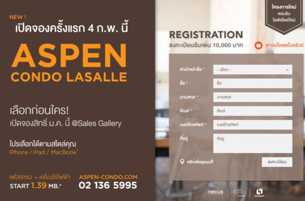 สำหรับผู้ที่สนใจโครงการ ASPEN Condo Lasalle สามารถลงทะเบียนเพื่อรับสิทธิพิเศษได้ที่ลิงก์ด้านล่างนี้