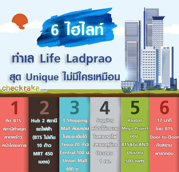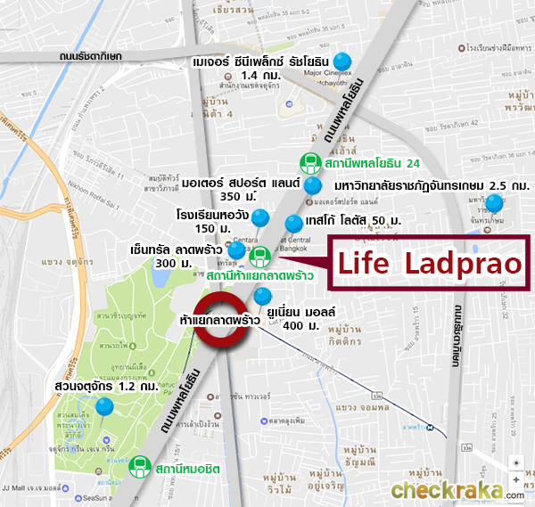 อยู่ห่างจากโครงการ 600 เมตร Life ลาดพร้าว มาพร้อมกับราคาเริ่มต้นเพียง 2.9 ล้านบาท เมื่อเปรียบเทียบกับทำเล และสาธารณูปโภคแบบครบครัน ใช้ชีวิตอยู่ได้จริงแบบนี้ ถือว่าคุ้มค่ามากๆ ค่ะ ตัวโครงการตั้งอยู่ในบนถนนพหลโยธิน ตรงข้ามเซ็นทรัล ลาดพร้าว ซึ่งเป็นทำเลที่ไม่ต้องอธิบายมาก เพราะว่าศักยภาพของย่านนี้พร้อมสำหรับการอยู่อาศัยมานานแล้วค่ะ รายล้อมไปด้วยห้างสรรพสินค้า แหล่งช้อปปิ้ง ร้านอาหาร อีกในไม่ช้ากลุ่ม BTS และ Gland ก็จะพัฒนาพื้นที่ขนาดใหญ่ตรงข้ามกับมอเตอร์ สปอร์ต แลนด์ เป็นคอมมูนิตี้มอลล์ อาคารสำนักงาน และตัดถนนให้เป็นทางลัดทะลุไปวิภาวดีได้ค่ะ หากโปรเจคนี้เสร็จก็จะส่งให้โครงการมีมูลค่ามากขึ้น ส่วนการเดินทางด้วยรถยนต์อาจจะติดขัดในช่วงเช้าและเย็น แต่จะใกล้กับทางด่วนและเข้าเมือง-ออกเมืองได้สะดวกค่ะ ประมาณปี 2563 รถไฟฟ้าสายสีเขียวจะเปิดให้บริการ ทางขึ้น-ลงรถไฟฟ้าสถานีห้าแยกลาดพร้าวก็จะอยู่ด้านหน้าโครงการพอดี สามารถเชื่อมต่อกับ MRT สถานีพหลโยธินอีกด้วย เป็นทำเลที่ควรค่ากับการอยู่อาศัยและหาไม่ได้อีกแล้วในกรุงเทพฯ หากโครงการมี Update เพิ่มเติม ทาง CheckRaka.com ก็จะไม่พลาดที่จะนำข่าวสารมาฝากทุกท่าน แล้วพบกันใหม่กับพรีวิวทำเลคอนโดโครงการหน้าค่ะ