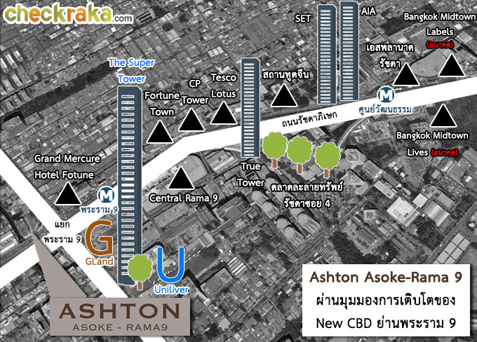 ภาพรวมในด้านทำเล โครงการ แอชตัน อโศก-พระราม 9 ตั้งอยู่ใจกลางแยก CBD พระราม 9 ห่างจากรถไฟฟ้า MRT สถานีพระราม 9 เพียง 120 ม. ซึ่งนับวันทำเลบริเวณนี้ก็จะยิ่งมีความชัดเจนของการพัฒนาแบบก้าวกระโดด ไม่ว่าจะเป็นแหล่งงาน โดยปัจจุบัน G Tower ได้เริ่มเปิดให้บริการในบางส่วนแล้ว รวมถึงตลาดหลักทรัพย์แห่งประเทศไทยแห่งใหม่ และอาคารสำนักงาน Unilever สำนักงานใหญ่ ก็ได้เปิดให้บริการไปก่อนหน้านี้ไม่นาน ในอนาคตก็จะมี Super Tower ตึกสูง 125 ชั้น (สูงที่สุดในไทย และอาเซียน คาดว่าจะเปิดให้บริการได้ในปี 2563) ก็จะเพิ่มมูลค่าทำเลในโซนนี้เข้าไปอีก นอกจากนี้ยังมีแหล่ง Shopping และ Lifestyle ที่อุดมสมบูรณ์อยู่ใกล้ๆ อย่าง Central Plaza Grand Rama 9, Fortune Town และ Esplanade ทำให้เป็นทำเลโครงการคอนโดที่น่าสนใจมากอีกโครงการนึงเลยค่ะ หากโครงการมี Update เพิ่มเติม ทาง CheckRaka.com จะเก็บมาฝากนะคะ แล้วพบกันใหม่กับพรีวิวทำเลคอนโดใหม่ค่ะ
