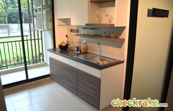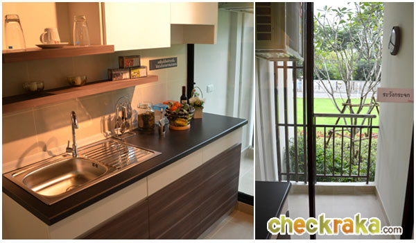 ถัดจากห้องนอนเข้ามาเป็นส่วนครัวที่ทางโครงการแถมเคาน์เตอร์พร้อมเจาะซิ้งค์ล้างจานขนาดหนึ่งหลุม และตู้ลอยติดข้างฝาสีเข้าชุดกันมาให้เรียบร้อย โดยรูปขวามือเป็นส่วนระเบียงที่อยู่ติดครัวเปิด-ปิดด้วยประตูเลื่อน ซึ่งโซนนี้ทั้งหมดปูพื้นด้วยกระเบื้องแผ่นกลางขนาด 40x 40 เซนติเมตร นอกจากนี้ทางโครงการยังตั้งใจแยกพื้นที่ส่วนครัวและห้องน้ำออกจากพื้นที่ในส่วนที่จำเป็นต้องใช้เครื่องปรับอากาศเพราะคำนึงถึงเรื่องการประหยัดพลังงาน Lay Out ห้องสตูดิโอสไตล์นี้น่าจะถูกใจลูกค้าหลายๆ ท่านเพราะตอบโจทย์เรื่องฟังก์ชั่นได้ดี