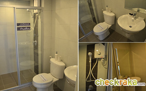 ส่วนสุดท้ายของห้องสตูดิโอคือห้องน้ำซึ่งทางโครงการเลือกใช้สุขภัณฑ์ทั้งหมดจาก Cotto และแถมเครื่องทำน้ำอุ่นของ Electrolux พร้อมฉากกั้นอาบน้ำเป็นกระจกนิรภัยแยกส่วนเปียกออกจากส่วนแห้ง