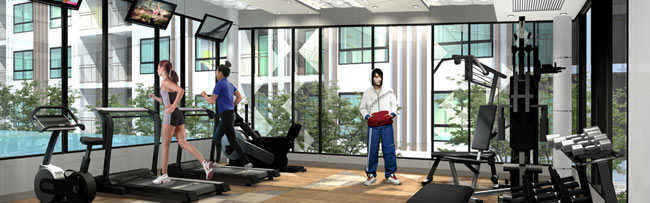 ภาพจำลองบรรยากาศห้อง Fitness มองเห็นวิวสระว่ายน้ำ