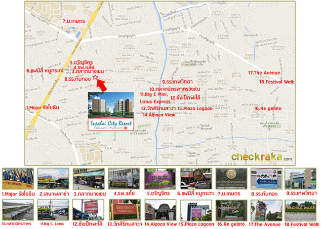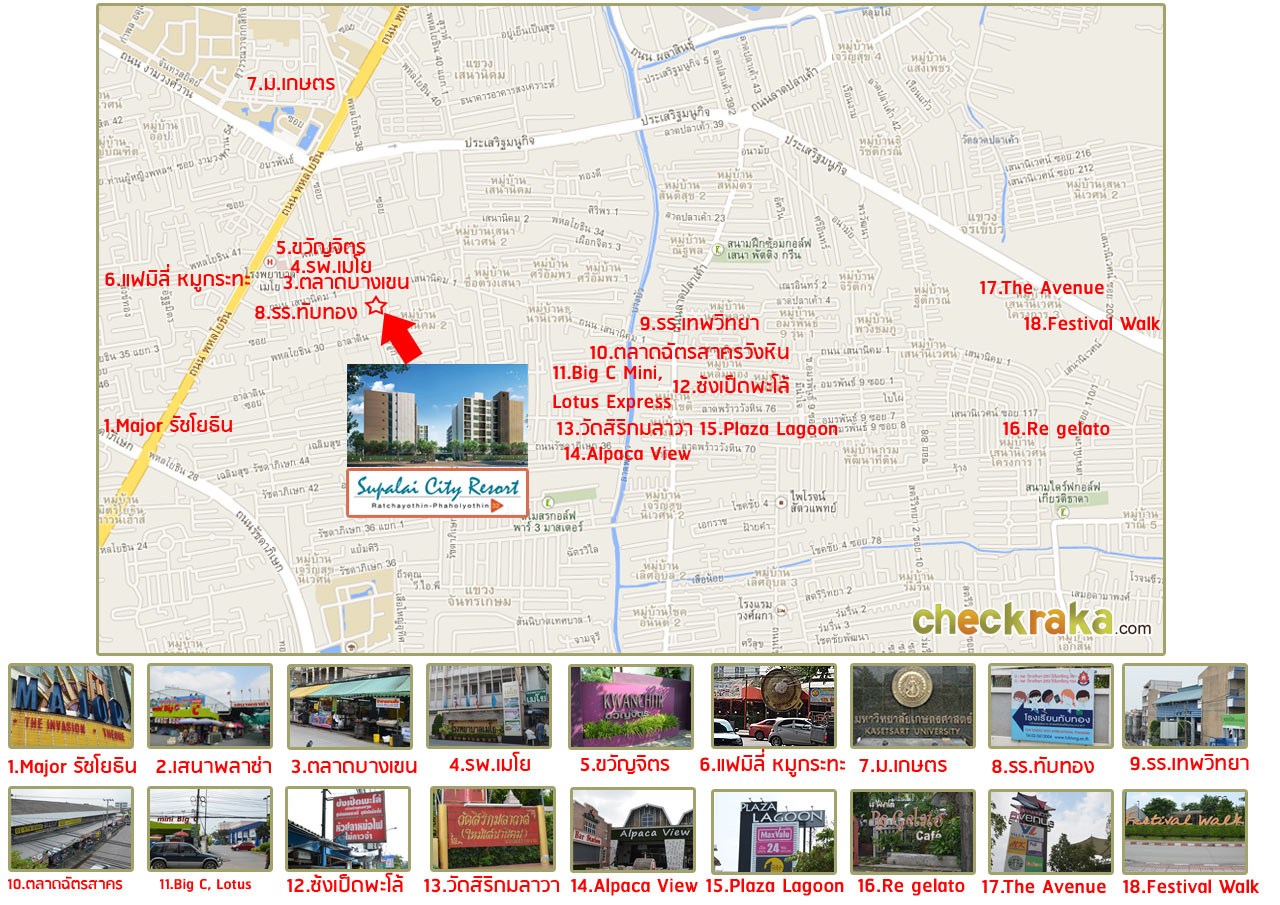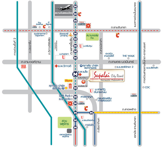 แผนที่ตั้งโครงการ ศุภาลัย วิตี้ รีสอร์ท รัชโยธิน-พหลโยธิน 32 คอนโดนี้ตั้งอยู่ที่ซอยพหลโยธิน 32 (หรือที่เรียกกันติดปากง่ายๆ ว่าซอยเสนานิคม 1) ถ้าสมมติง่ายๆ นับจุดเริ่มต้นจาก Major รัชโยธิน ก็ตรงมาเรื่อยๆ มุ่งหน้าไปทาง ม. เกษตรฯ บนถนนใหญ่พหลโยธิน เสร็จแล้วให้มองทางขวาไว้เพื่อเลี้ยวขวาเข้าซอยพหลโยธิน 32 พอเลี้ยวแล้วก็ตรงเข้าไปเรื่อยๆ ประมาณ 670 เมตรก็จะเจอกับโครงการนี้ด้านขวามือ หรือในทางกลับกันถ้าวิ่งมาจากทาง ม. เกษตรฯ มุ่งหน้าไปทาง Major รัชโยธิน ก็ให้ตรงมาเรื่อยๆ บนถนนใหญ่พหลโยธิน พอซ้ายมือเห็นโรงพยาบาลเปาโลก็เตรียมเลี้ยวซ้ายเข้าซอยพหลโยธิน 32 ได้เลย จากนั้นตรงมาเรื่อยๆ ประมาณ 670 เมตร ในซอยจะเห็นโครงการอยู่ทางขวามือ (ดูทางลัดเข้า-ออกโครงการเพิ่มเติมได้ในหัวข้อ "ทางลัดในซอยเสนานิคม")