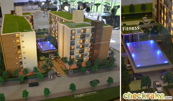 โมเดลโชว์ให้เห็นส่วนกลางอย่างสระว่ายน้ำและฟิตเนสที่แยกออกมาอยู่ตรงกลางพื้นที่ของโครงการ