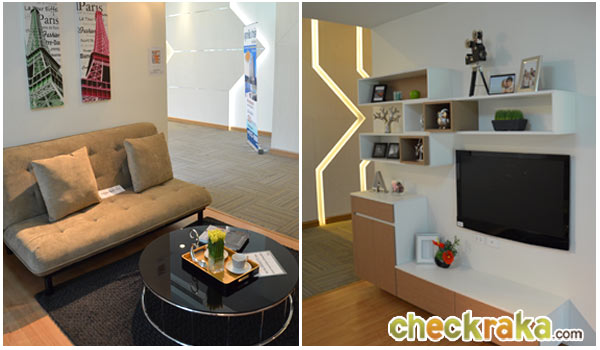 รูปซ้ายมือเป็นโซฟารับแขกแบบผ้าสามารถปรับนอนได้ขนาดกลางๆ 2 ที่นั่ง พร้อมโต๊ะกลางกระจกแบบกลม ส่วนรูปขวามือติดโมเดล LCD 32" กับข้างฝา พร้อมตู้ Built-in เป็นช่องๆ ไว้ให้ใส่ของโชว์ และเป็นตู้วางรองเท้า