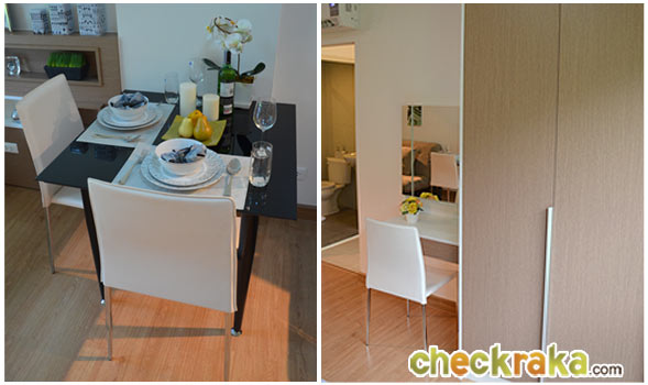 ส่วนทานข้าวจัดโต๊ะทานอาหารพร้อมเก้าอี้ 2 ที่นั่ง รูปขวามือเป็นตู้เสื้อผ้า Built-in