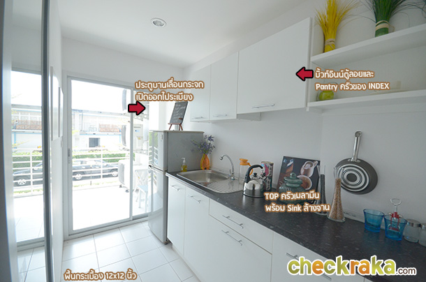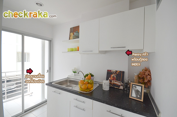 และผนังทาสีขาวเรียบ พร้อม Pantry ของ INDEX แบบแถวเดียวที่ทางโครงการจัดมาให้