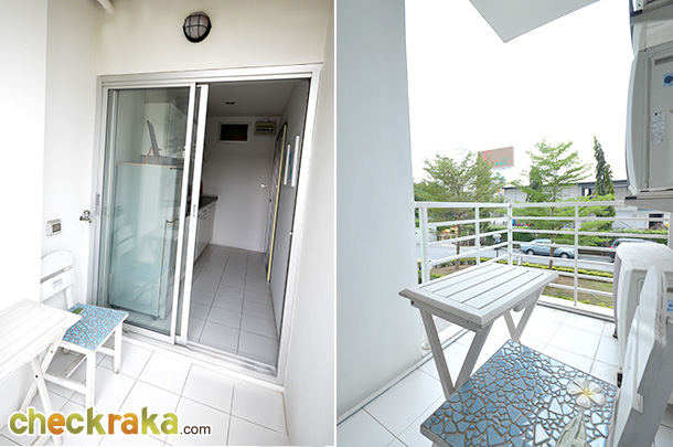 เปิดประตูเลื่อนออกไปที่ระเบียงจะเจอระเบียงขนาดตามรูปนี้ค่ะ