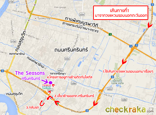 หากมาจากทางด่วนวงแหวนรอบนอกตะวันออกให้ตรงมาเรื่อยๆ แล้วออกซ้ายตรงทางออกถนนศรีนครินทร์ (สมุทรปราการ)