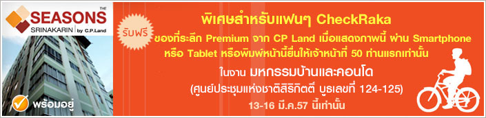 พิเศษ! สำหรับแฟนๆ CheckRaKa.com รับฟรีของที่ระลึก Premium จาก CP Land เมื่อแสดงภาพนี้ ผ่าน Smartphone หรือ Tablet หรือพิมพ์หน้านี้ยื่นให้เจ้าหน้าที่ ที่บูธเลขที่ 124-125 จำนวน 50 ท่านแรกเท่านั้น ในงาน มหกรรมบ้าน และคอนโด ณ ศูนย์ประชุมแห่งชาติสิริกิตต์ 13-16 มี.ค. 57 นี้เท่านั้น