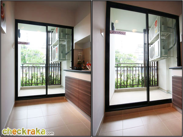 ถัดจากโซนห้องครัวเป็นระเบียงกั้นด้วยกระจกบานเลื่อนอลูมิเนียมสีดำหน้ากว้าง 2.05 เมตร