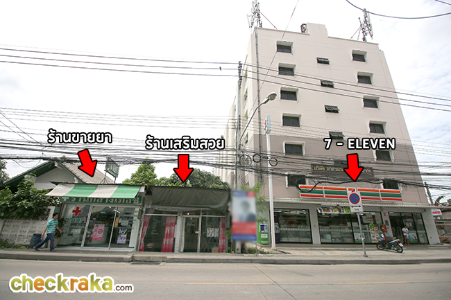และถ้ามองไปฝั่งตรงข้ามก็จะมีร้านขายยา, ร้านเสริมสวย และ 7-Eleven ค่ะ