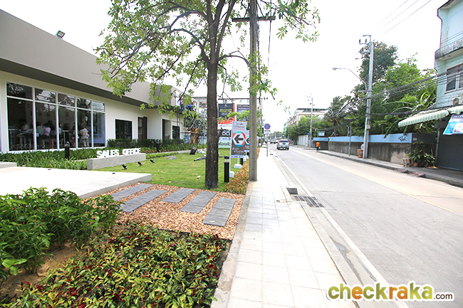 บริเวณด้านหน้าสำนักงานขายตกแต่งด้วยต้นไม้ได้อย่างสวยงาม
