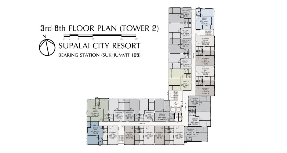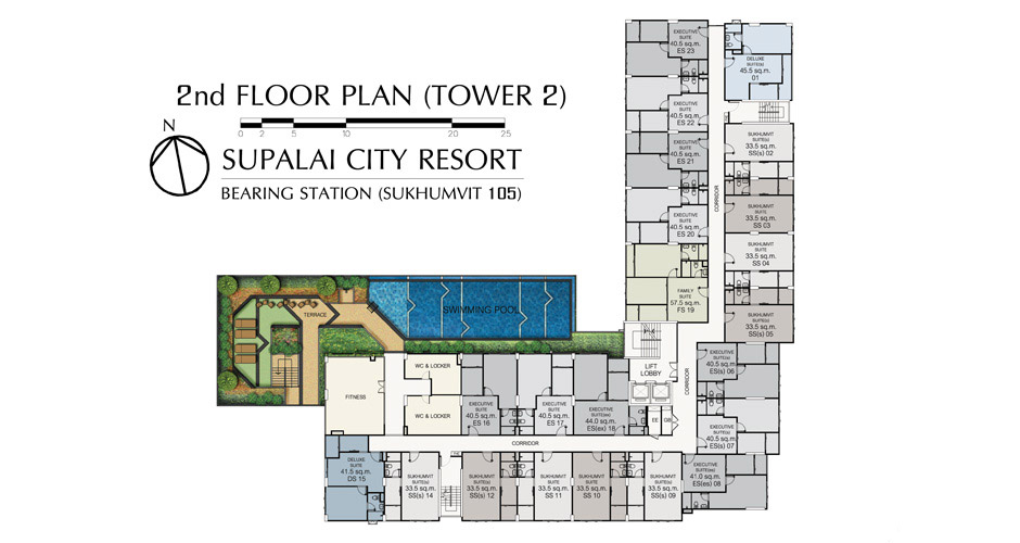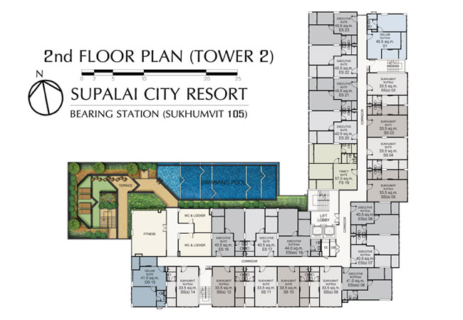 โดยชั้นนี้จะมีห้องอยู่เพียง 22 ยูนิต เท่านั้น(คลิกเพื่อดูภาพ Floor Plan ขนาดใหญ่ของอาคาร 2 ชั้น 2)