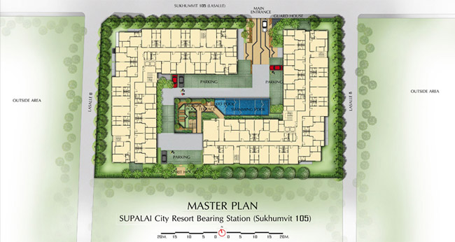 - อาคารและตัวโครงการโดยรวม - โดยรวมดีไซน์ของตัวอาคารเป็นแบบเรียบง่ายตามสไตล์ศุภาลัย ประกอบไปด้วยตึกรูปตัว L สองอาคาร คล้ายคลึงกับโครงการซิตี้รีสอร์ทรุ่นพี่ก่อนหน้านี้ คือ "ศุภาลัย ซิตี้ รีสอร์ท รัชโยธิน พหลโยธิน 32" เนื่องจากซอยสุขุมวิท 105 นี้เป็นซอยแคบ ตัวโครงการจึงทำได้แค่ Low-Rise สูง 8 ชั้น แปลงที่ดินโครงการนี้ถือว่าไม่เล็ก คือ 3 ไร่ แต่ทางศุภาลัยก็สร้าง 2 อาคารเต็มพื้นที่พอสมควร ส่วนกลางนั้นมีความตั้งใจออกแบบให้เป็นสไตล์ของซิตี้รีสอร์ท คือ มีสระว่ายน้ำ และสวน Terrace สามารถนั่งเล่นพักผ่อนได้ แต่จะมีอยู่เพียงในอาคารเดียวเท่านั้นทำให้ผู้อยู่อาศัยทั้ง 2 อาคารต้องมาแชร์การใช้ส่วนกลางเหล่านี้ด้วยกันซึ่งอาจหนาแน่นได้ในช่วงเวลาพักผ่อนอย่างเย็นวันเสาร์หรือเย็นอาทิตย์ ส่วนลิฟต์โดยสารของแต่ละอาคารมีจำนวน 2 ตัวต่ออาคาร คิดเป็นสัดส่วนความหนาแน่นของการใช้งานลิฟต์อยู่ที่ประมาณ 83 - 84 ยูนิตต่อลิฟต์ 1 ตัว ถือเป็นสัดส่วนการใช้งานที่ดีทีเดียวไม่น่าจะต้องรอลิฟต์นาน ในส่วนของพื้นที่จอดรถยนต์นั้น มีทั้งแบบในร่มใต้อาคาร และรอบๆ อาคารเฉลี่ยประมาณ 49% (รวมจอดซ้อนคัน) ถือว่าเป็นสัดส่วนที่ใช้ได้สำหรับคอนโดในราคาระดับนี้