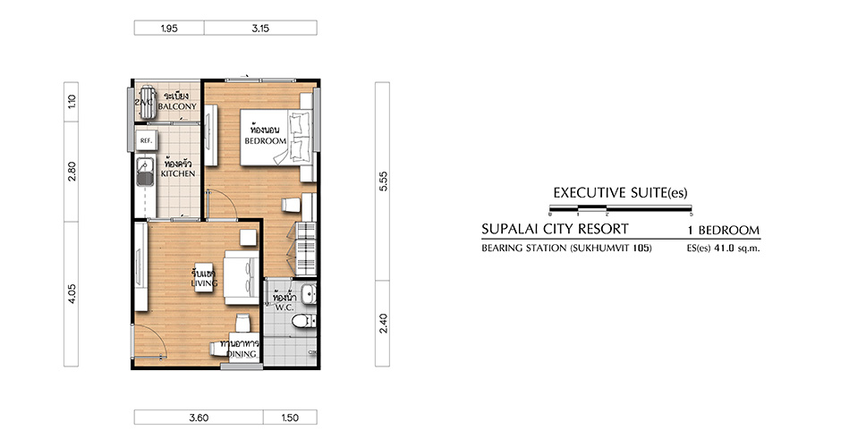 (คลิกเพื่อชมแปลนห้องขนาดใหญ่) - EXECUTIVE SUITE (es) ห้องแบบ 1 BEDROOM (1 ห้องนอน, 1 ห้องน้ำ, 1 ห้องครัว) - เนื้อที่ 41.5 ตร.ม.