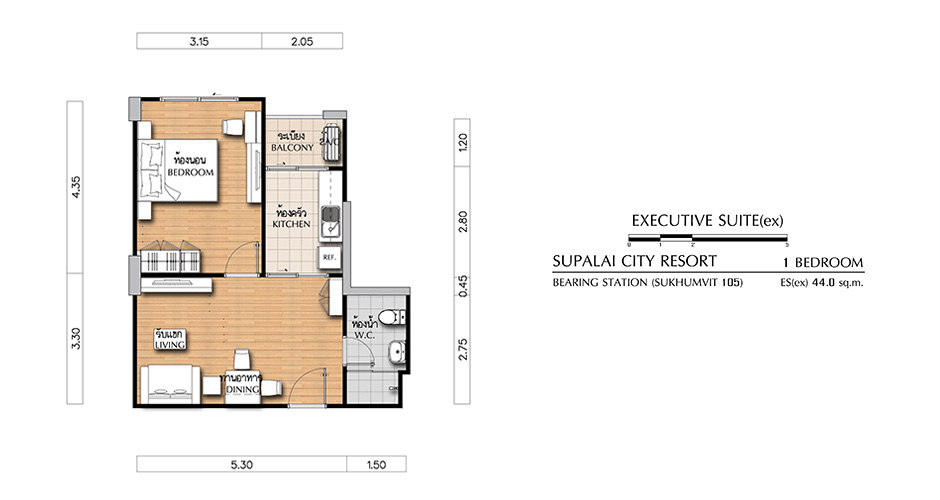 (คลิกเพื่อชมแปลนห้องขนาดใหญ่) - EXECUTIVE SUITE (ex) ห้องแบบ 1 BEDROOM (1 ห้องนอน, 1 ห้องน้ำ, 1 ห้องครัว) - เนื้อที่ 44.0 ตร.ม.