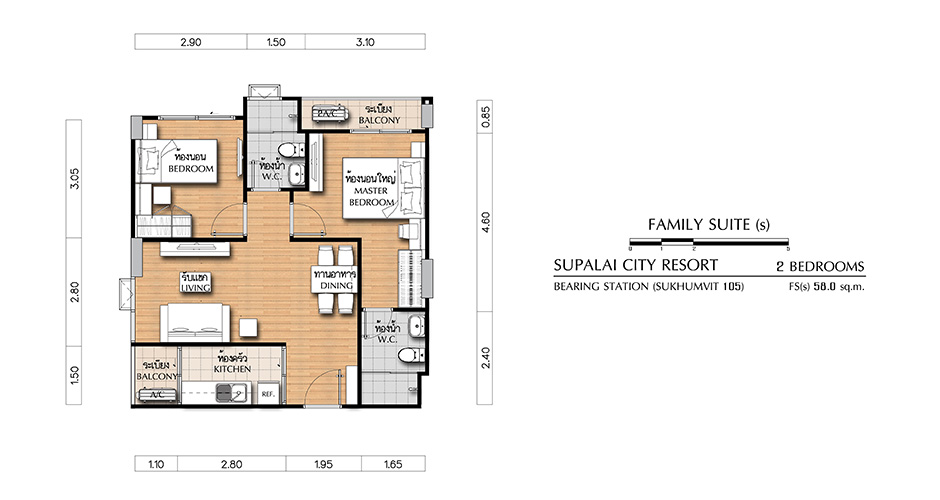 (คลิกเพื่อชมแปลนห้องขนาดใหญ่) - FAMILY SUITE (s) ห้องแบบ 2 BEDROOM (2 ห้องนอน, 2 ห้องน้ำ, 1 ห้องครัว) - เนื้อที่ 58.0 ตร.ม.