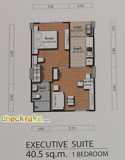 (คลิกเพื่อชมแปลนห้องขนาดใหญ่) - EXECUTIVE SUITE ห้องแบบ 1 BEDROOM (1 ห้องนอน, 1 ห้องน้ำ, 1 ห้องครัว) - เนื้อที่ 40.5 ตร.ม.