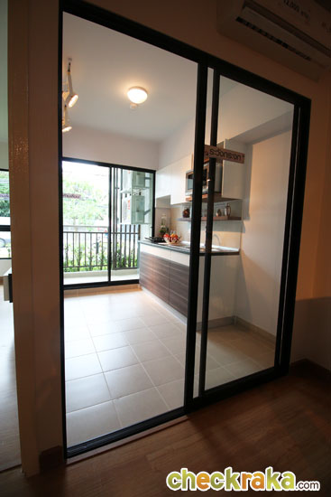 ก่อนถึงโซนครัวกั้นด้วยประตูบานเลื่อนอลูมิเนียมกรอบดำแยกส่วนชัดเจนด้วยกระเบื้องสีอ่อน
