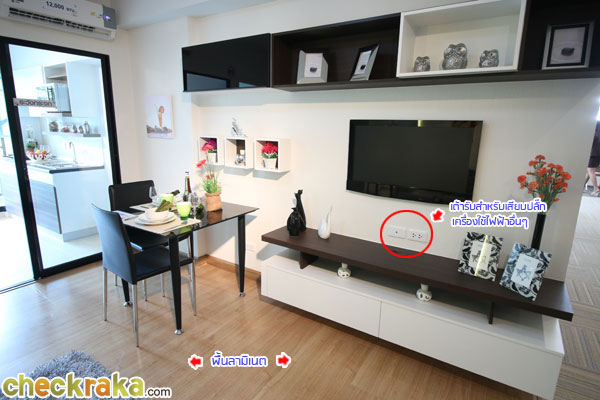 พื้นห้องเป็นพื้นแบบลามิเนต เจาะช่องสำหรับเต้ารับด้านล่างทีวีที่แขวนผนัง เพิ่มความสะดวกในการใช้งานอื่นๆ