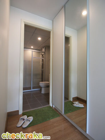 บริเวณหน้าห้องน้ำเมื่อเดินผ่านเตียงเข้าไปจะเป็นตู้เสื้อผ้า Built-in ขนาด 3 บานประตู และถัดไปเป็นห้องน้ำ