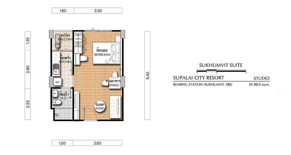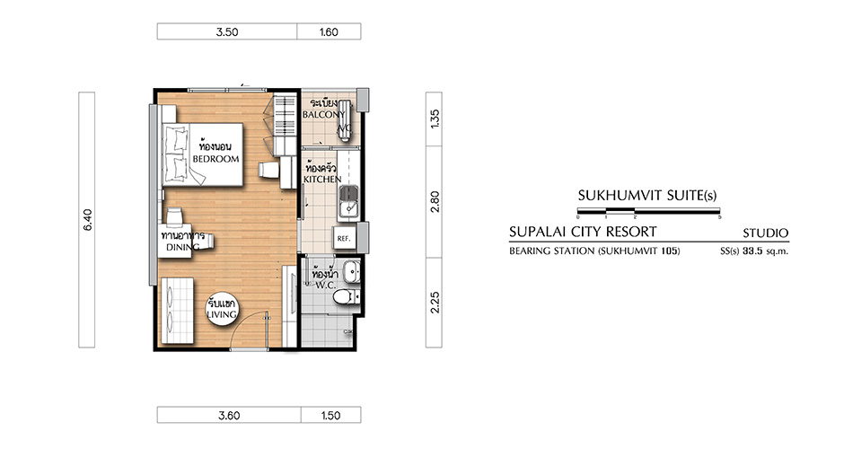 - SUKHUMVIT SUITE ห้องสตูดิโอ (1 ห้องน้ำ, 1 ห้องครัว) - เนื้อที่ 33.5 ตร.ม.