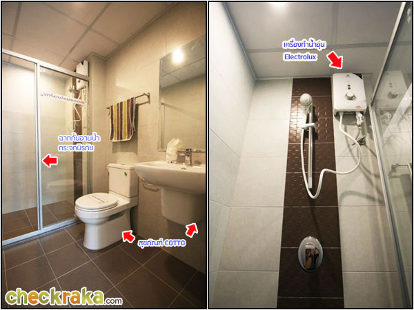 ภายในห้องน้ำใช้กระเบื้องสีเข้มแยกส่วนแห้งและส่วนเปียกด้วยฉากกั้นบานเลื่อนสีขาว ราคาและค่าใช้จ่ายที่เกี่ยวข้องโดยประมาณ (25 ก.ค. 57)